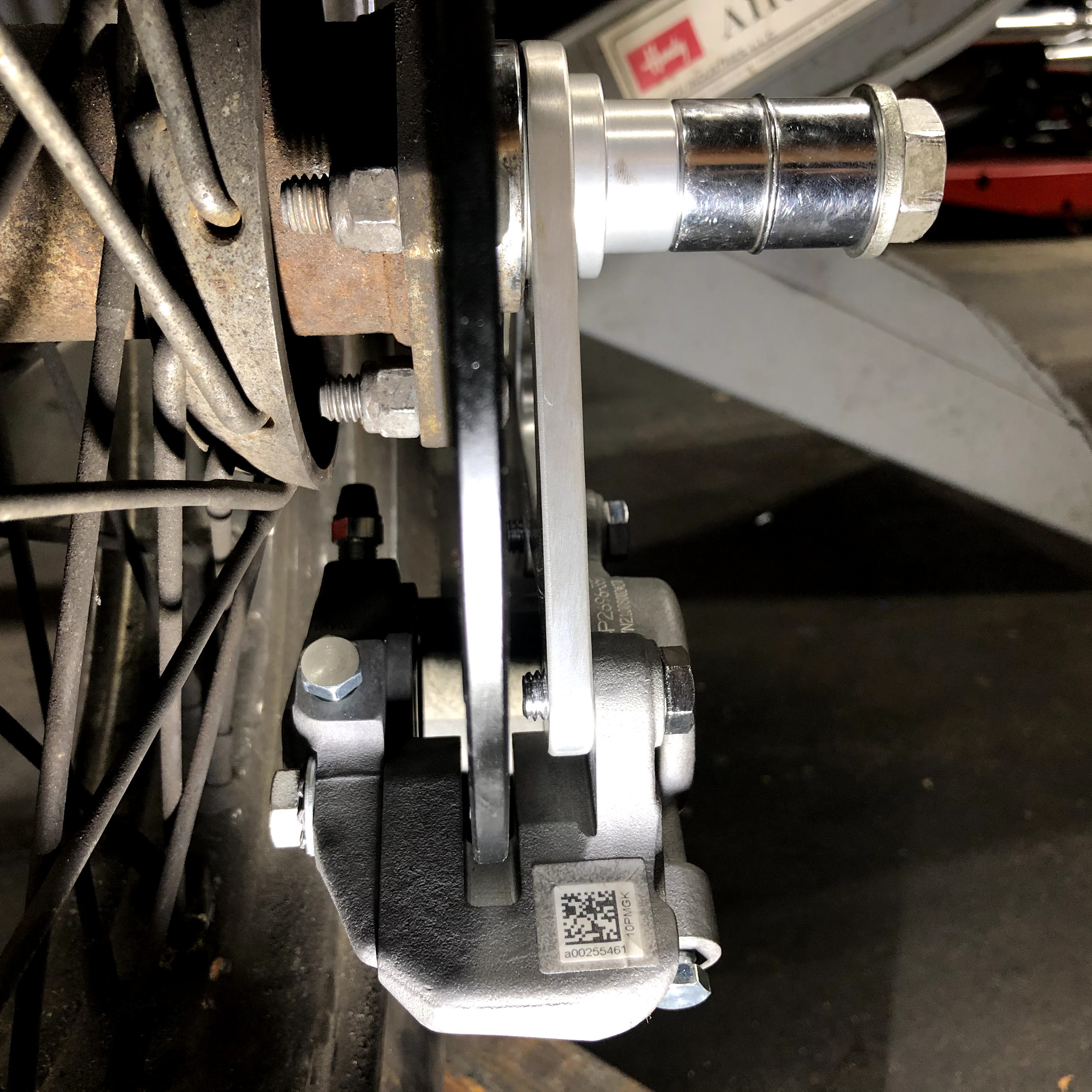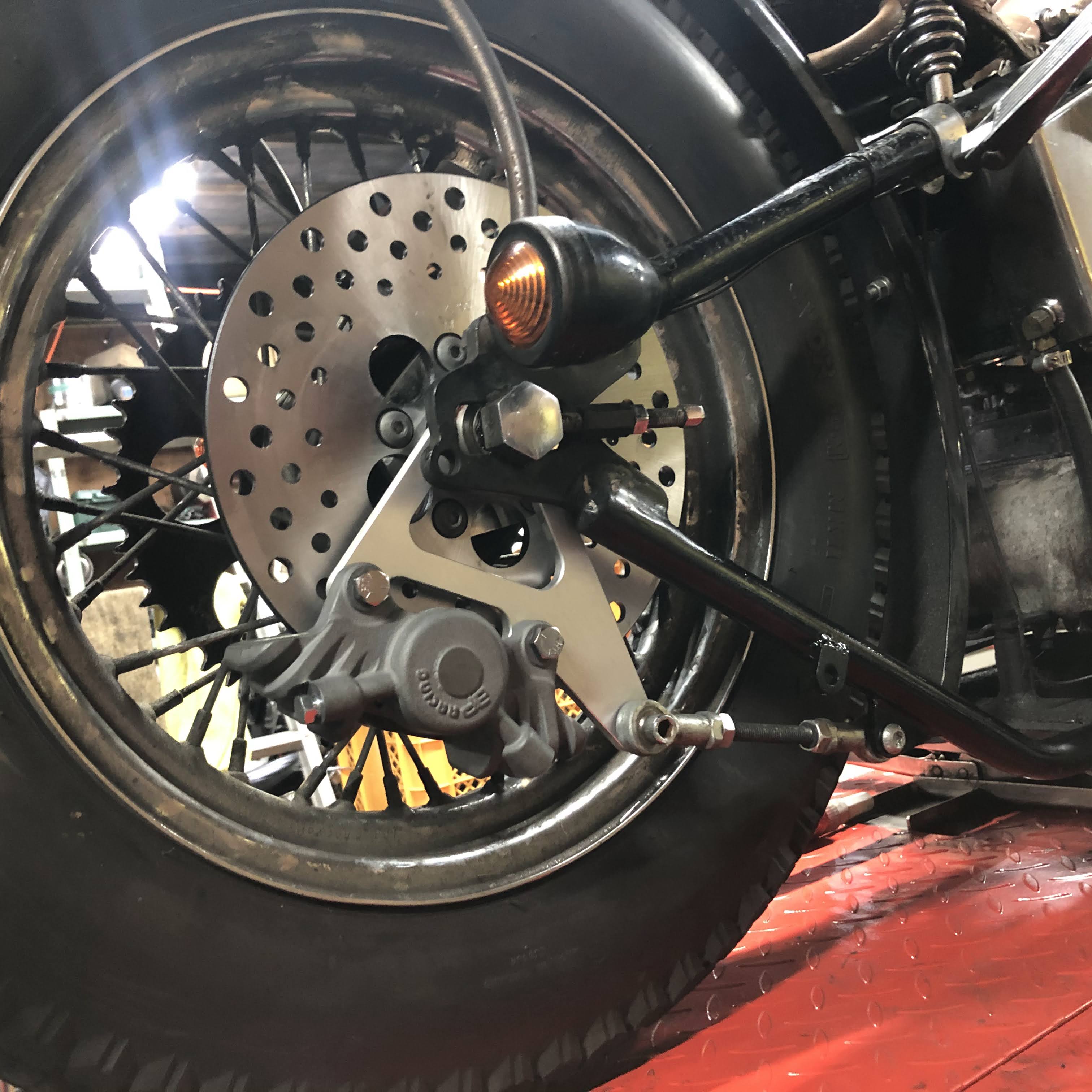 80FLH様 リアブレーキキャリパーをAP Racing CP2696に変更、キャリパーセンター出し、フレーム側トルクロッドマウント加工しました。