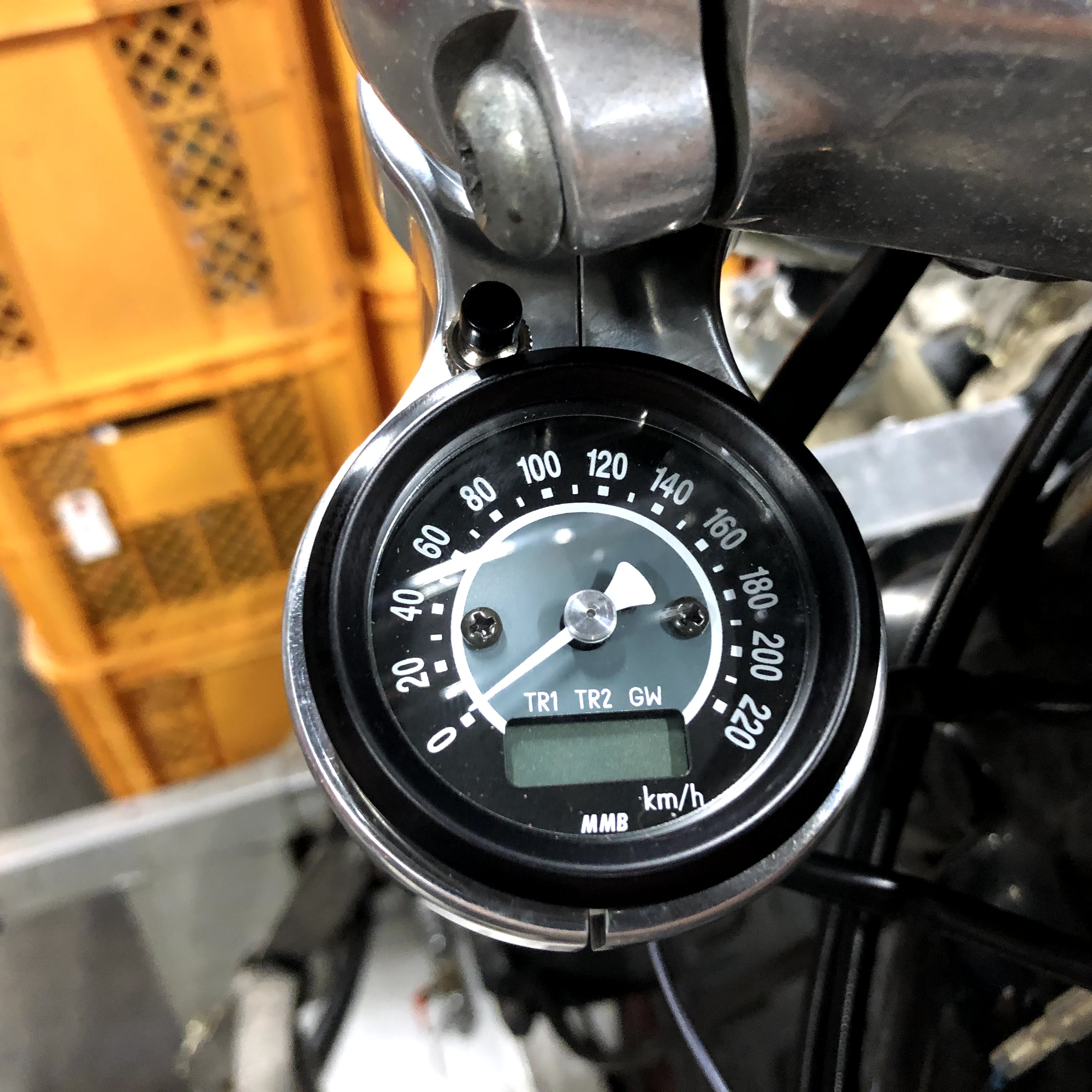 97FXD様 電気式スピードメーター取付け、メーターブラケットに表示切り替えのファンクションスイッチ取付け加工、スピードメーターのキャリブレーション作業です。