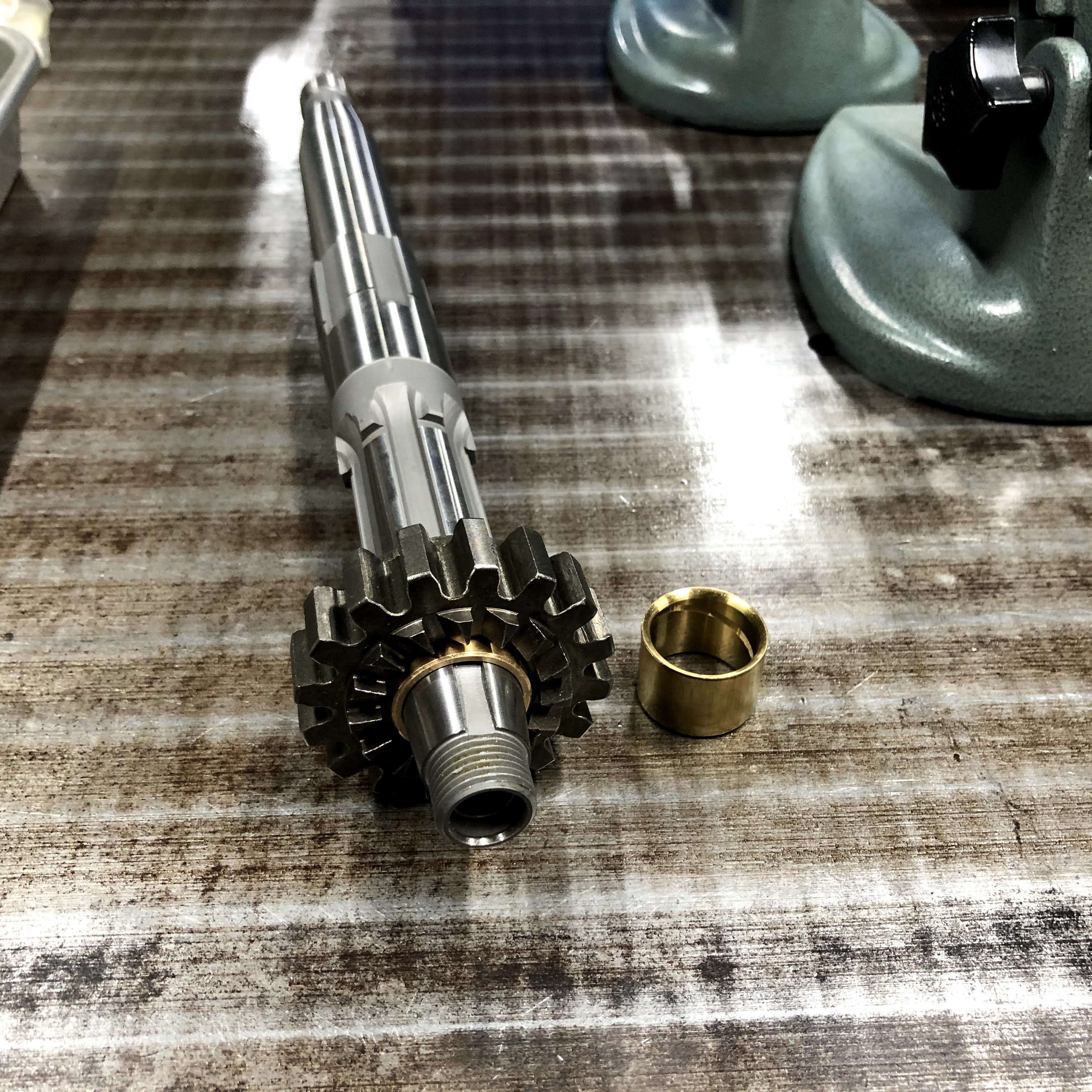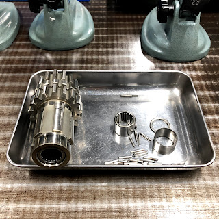 メインシャフト単体の状態の方が計測しやすいのでこの状態でスタータークラッチのブッシュも仕上げます。