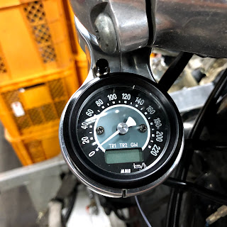 97FXD様 電気式スピードメーター取付け、メーターブラケットに表示切り替えのファンクションスイッチ取付け加工、スピードメーターのキャリブレーション作業です。